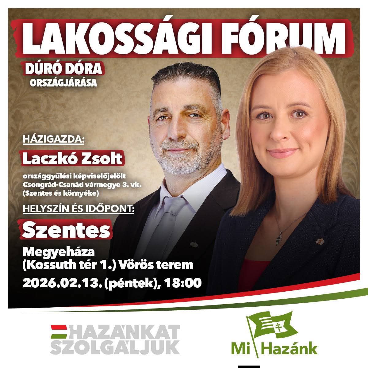 Dúró Dóra országjárása – 2026. február 13 péntek, Szentes. Házigazda: Laczkó Zsolt országgyűlési képviselőjelölt 3. vk.