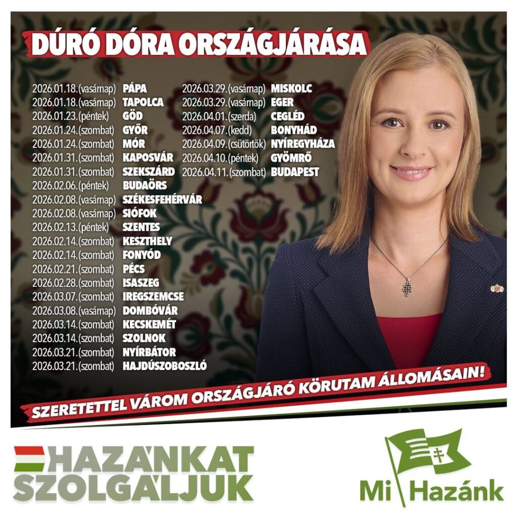 Dúró Dóra országjárása – 2026. február 13 péntek, Szentes. Házigazda: Laczkó Zsolt országgyűlési képviselőjelölt 3. vk. Facebook Twitter Messenger Email